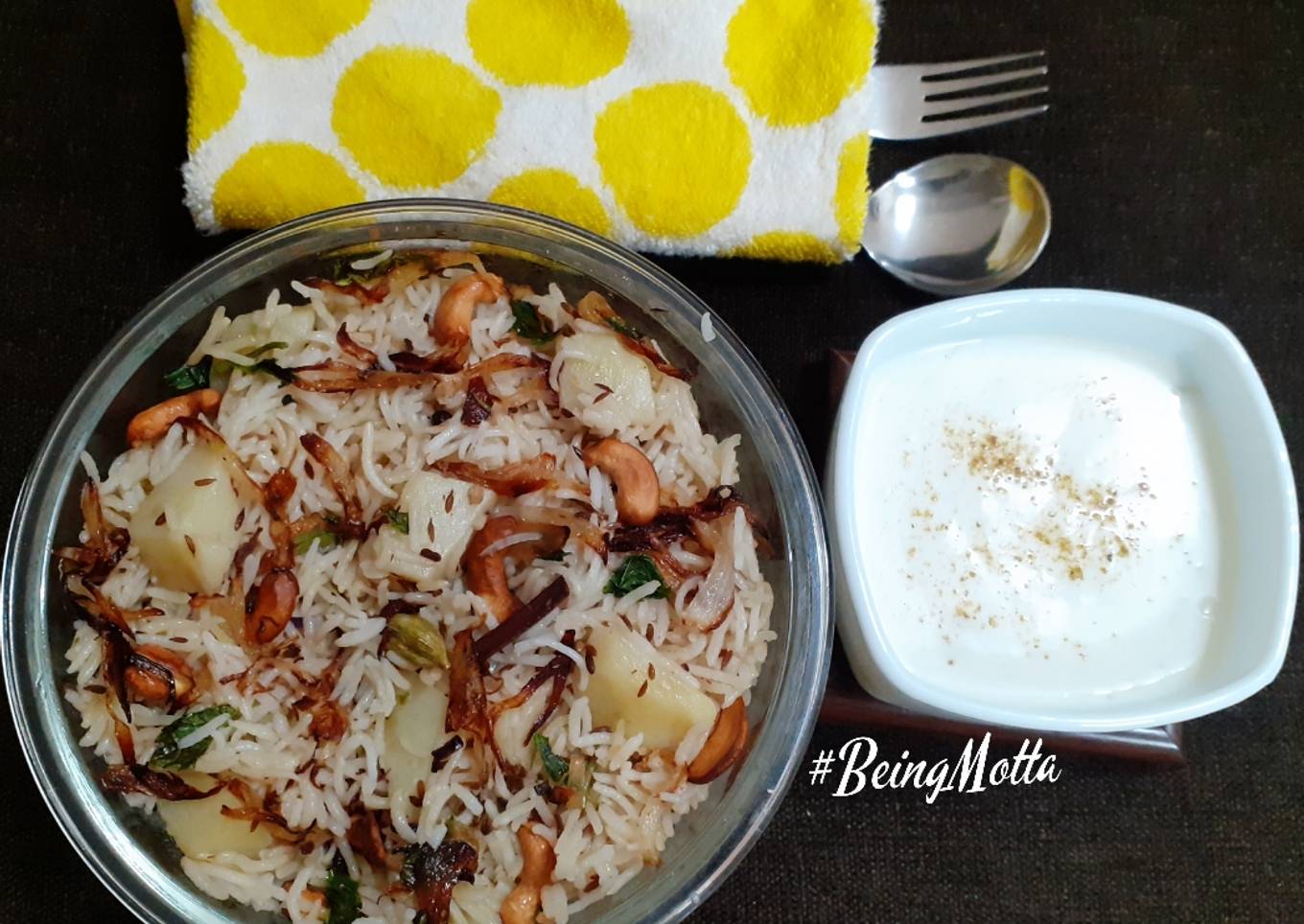 - With fork mix the prepared potato pulao. Remove bay leaf. Garnish with onion barista and fried cashew nuts. Serve with fresh curd.